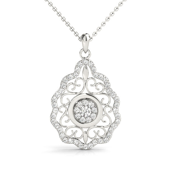 This exquisite round diamond halo pendant showcases a stunning central cluster of round brilliant diamonds, beautifully set in a classic halo setting. The intricate filigree design adds an elegant touch, enhancing the pendant's allure and sophistication. Crafted in lustrous white gold, this pendant is a timeless piece that exudes grace and charm, making it a perfect accessory for any occasion.