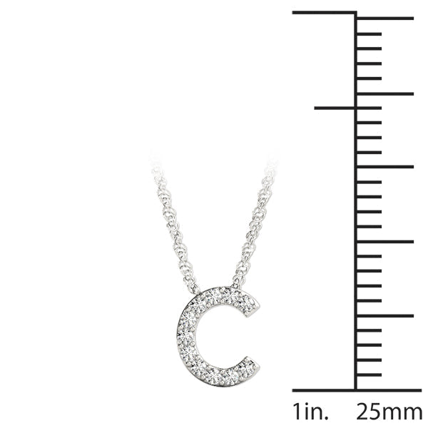 This elegant pendant necklace features a beautifully crafted letter 'C' adorned with round brilliant diamonds set in a pavé style. The stones are securely held in place with a classic prong setting, ensuring both brilliance and durability. The pendant hangs gracefully from a delicate chain, making it a perfect piece for everyday wear or special occasions. Its timeless design and sparkling diamonds make it a stunning addition to any jewelry collection.