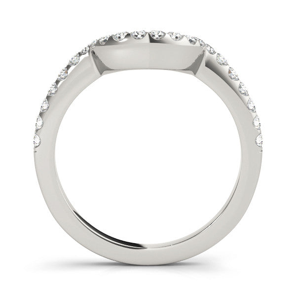 This elegant band features a graceful curve, designed to perfectly complement an engagement ring. The band is adorned with round brilliant-cut diamonds set in a pavé style, creating a continuous sparkle around the finger. Crafted in a sleek metal, the eternity band showcases the diamonds' brilliance, while the prong setting securely holds each stone in place. Ideal for stacking or wearing alone, this band exudes timeless sophistication and charm.