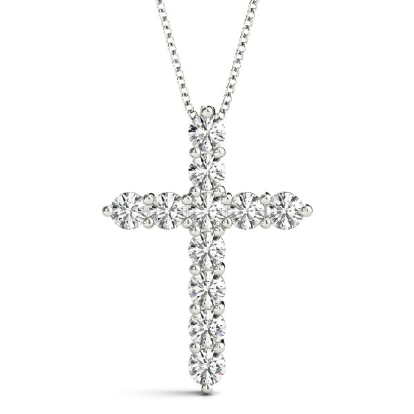 This elegant cross pendant features a stunning array of round diamonds, each meticulously set in a secure prong setting to maximize their brilliance and sparkle. The classic cross design is both timeless and meaningful, making it a perfect accessory for any occasion. Crafted with precision and care, this pendant hangs gracefully from a delicate chain, ensuring it sits beautifully against the neckline. Ideal for those who appreciate fine craftsmanship and the enduring beauty of diamonds, this piece is a testament to both faith and fashion.