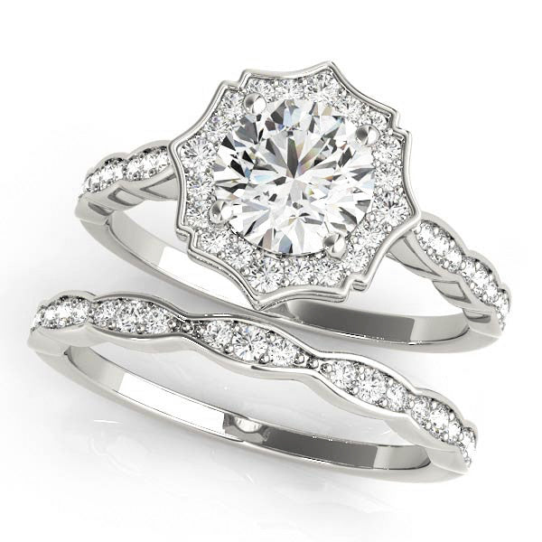 White gold Round Halo Diamond Engagement Ring with Milgrain Band and Four-Prong Setting