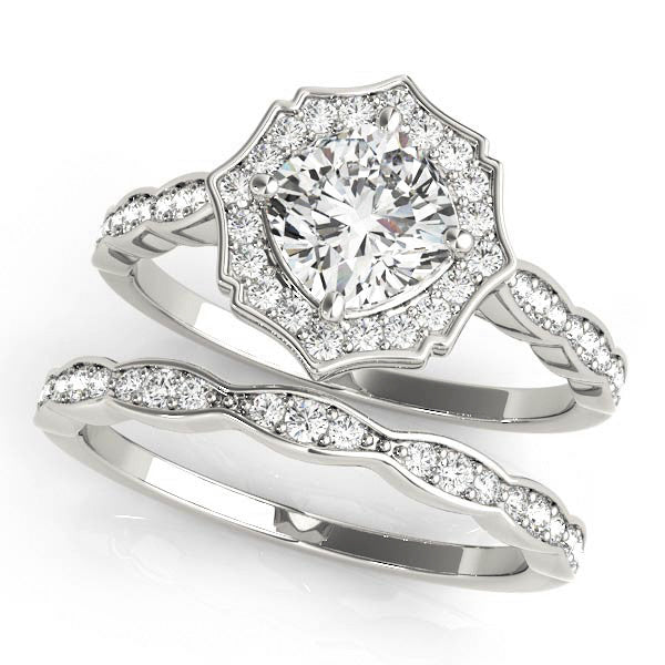 White gold Round Halo Diamond Ring with Milgrain Band and Four-Prong Setting