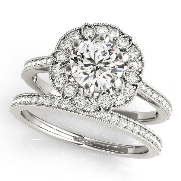 White gold Round Halo Diamond Ring with Milgrain Pave Band and Prong Setting