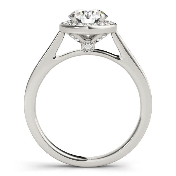 White gold Round Halo Solitaire Diamond Ring with Pave Band and Bezel Setting