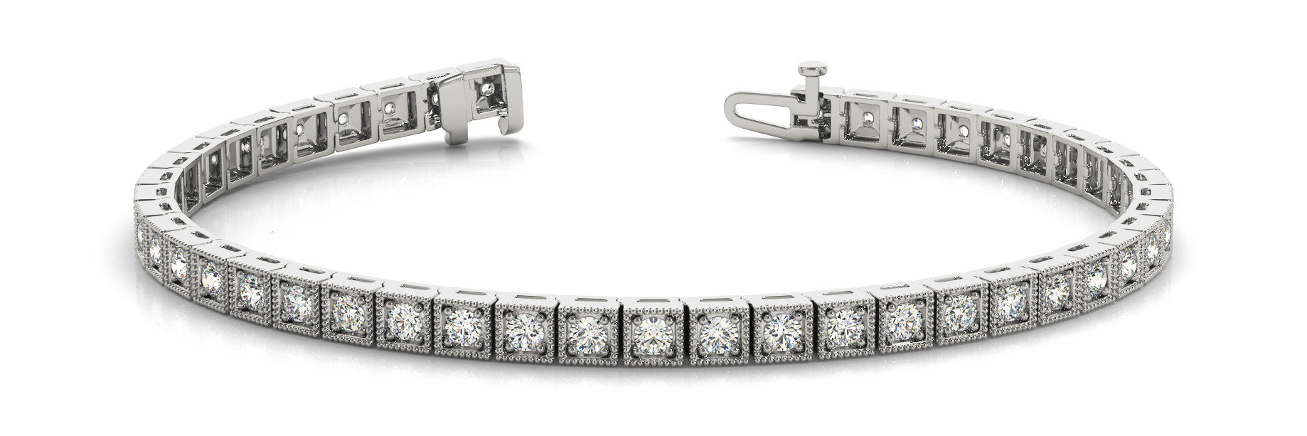 This exquisite Square Milgrain Diamond Tennis Bracelet features a stunning array of round-cut diamonds, each securely nestled within a square milgrain setting. The elegant design showcases a continuous line of sparkling stones, perfectly aligned along a sleek, polished band. The bracelet is crafted with a secure box clasp and safety latch, ensuring both style and durability. Ideal for any occasion, this timeless piece adds a touch of sophistication and glamour to any ensemble.