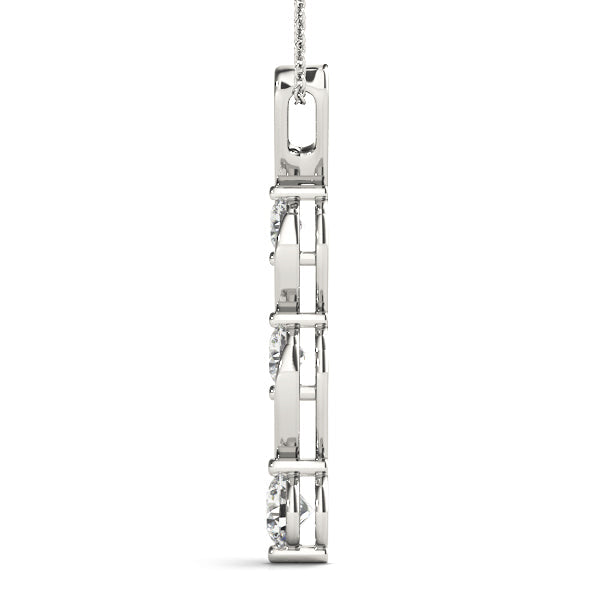 This elegant pendant features a stunning trio of round brilliant diamonds, each expertly prong set to maximize their sparkle and brilliance. The stones are gracefully arranged in a vertical twist design, creating a timeless and sophisticated look. Crafted in lustrous metal, this pendant is perfect for adding a touch of glamour to any outfit, making it an ideal choice for both everyday wear and special occasions.