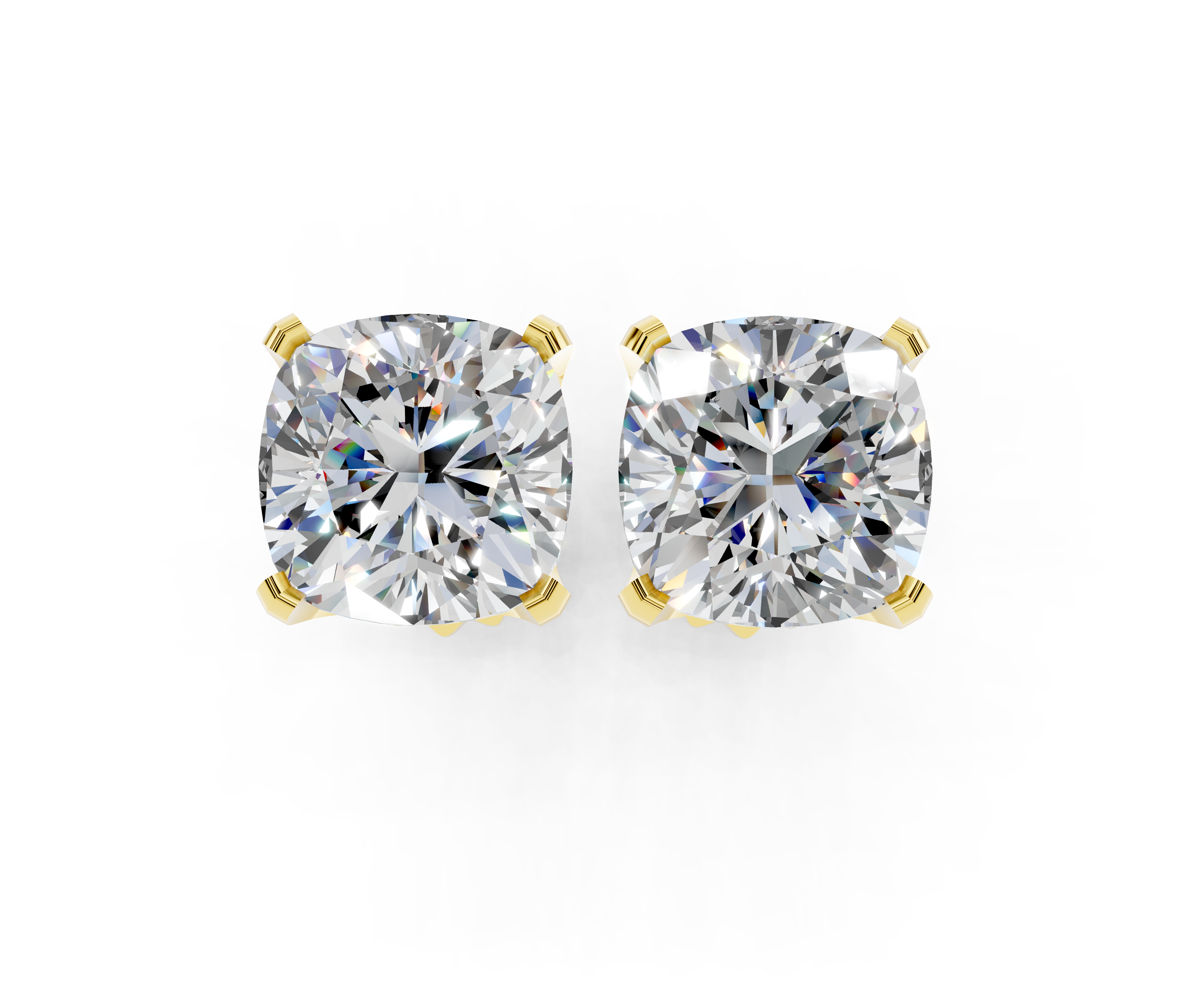 These exquisite earrings feature cushion brilliant diamonds, each securely held in a classic four-prong basket setting. The stones are expertly cut to maximize their sparkle and brilliance, making them a timeless addition to any jewelry collection. Set in lustrous yellow gold, these stud earrings offer a perfect blend of elegance and sophistication, ideal for both everyday wear and special occasions. The secure push-back or screw-back closure ensures comfort and ease of wear, making these earrings a must-have for any jewelry enthusiast.