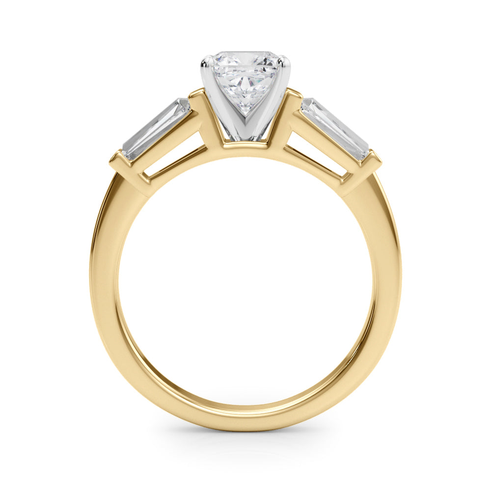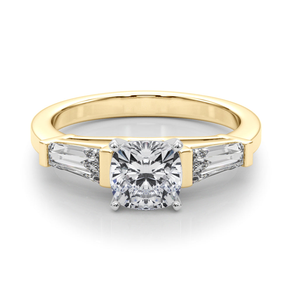 Yellow gold Cushion Cut Diamond Solitaire Ring with Tapered Baguette Accents and Four-Prong Setting