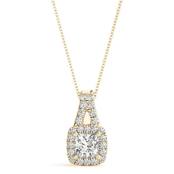 Yellow gold Cushion Halo Diamond Pendant with Princess Cut Stone and Four-Prong Setting