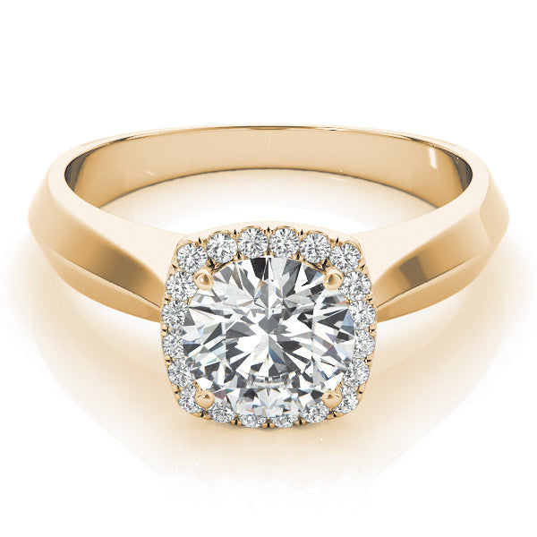 Yellow gold Cushion Halo Round Brilliant Solitaire Ring with Tapered Band and Four-Prong Setting