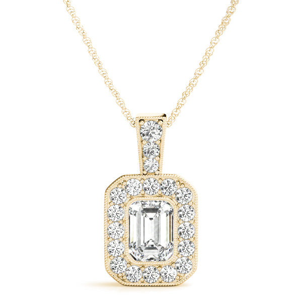 Yellow gold Emerald Cut Halo Diamond Pendant with Pavé Setting