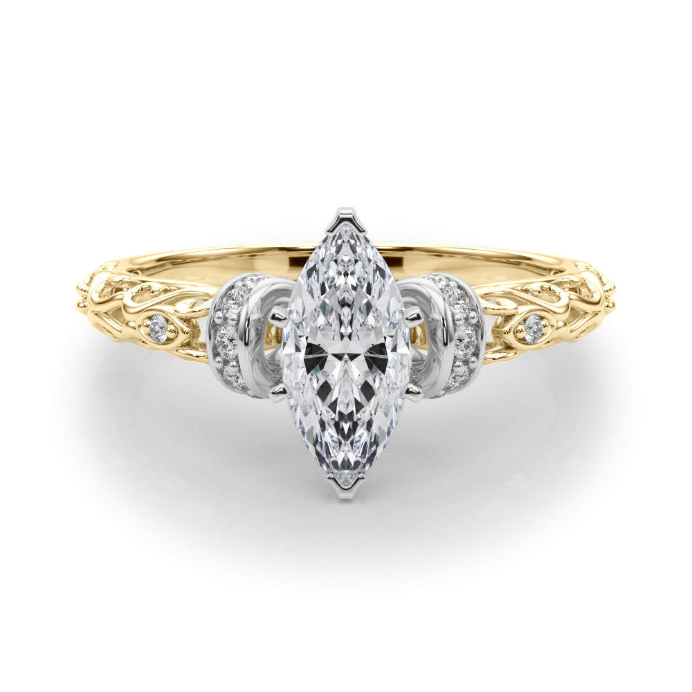 Yellow gold Marquise Solitaire Diamond Ring with Filigree Band and Four-Prong Setting