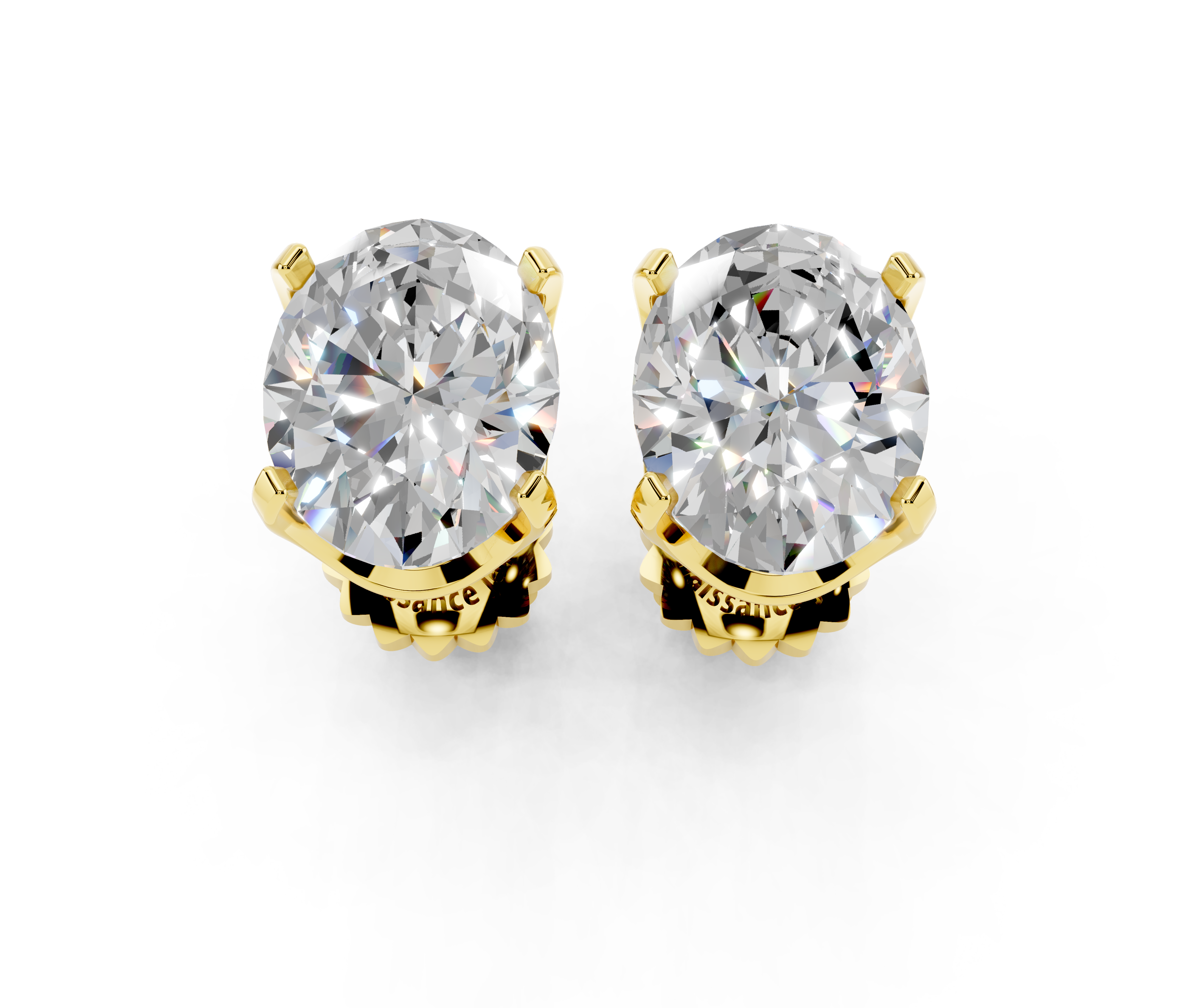 These exquisite earrings feature oval brilliant diamonds, each securely held in a classic four-prong basket setting. The stones are expertly cut to maximize their sparkle and brilliance, making them a timeless addition to any jewelry collection. Set in lustrous yellow gold, these stud earrings offer a perfect blend of elegance and sophistication, ideal for both everyday wear and special occasions. The secure push-back or screw-back closure ensures comfort and ease of wear, making these earrings a must-have for any jewelry enthusiast.