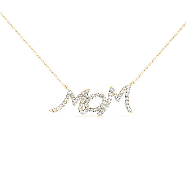 This elegant pendant features the word 'Mom' beautifully crafted in a delicate script style, adorned with sparkling round diamonds set in a pavé design. Each diamond is securely held in place with a prong setting, ensuring maximum brilliance and shine. The pendant is suspended from a fine chain, making it a perfect gift to celebrate and honor the special bond with a mother. Its timeless design and exquisite craftsmanship make it a cherished piece suitable for any occasion.