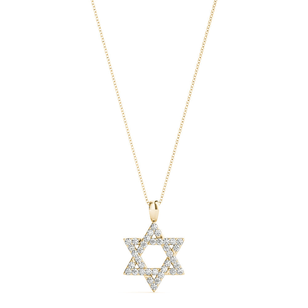 This exquisite pendant features a stunning Star of David design, adorned with shimmering round diamonds set in a pavé style. Each diamond is securely held in place with a four-prong setting, creating a captivating sparkle. Crafted with precision, this pendant is suspended from a delicate chain, making it a perfect blend of elegance and symbolism. Ideal for special occasions or everyday wear, it adds a touch of brilliance to any ensemble.