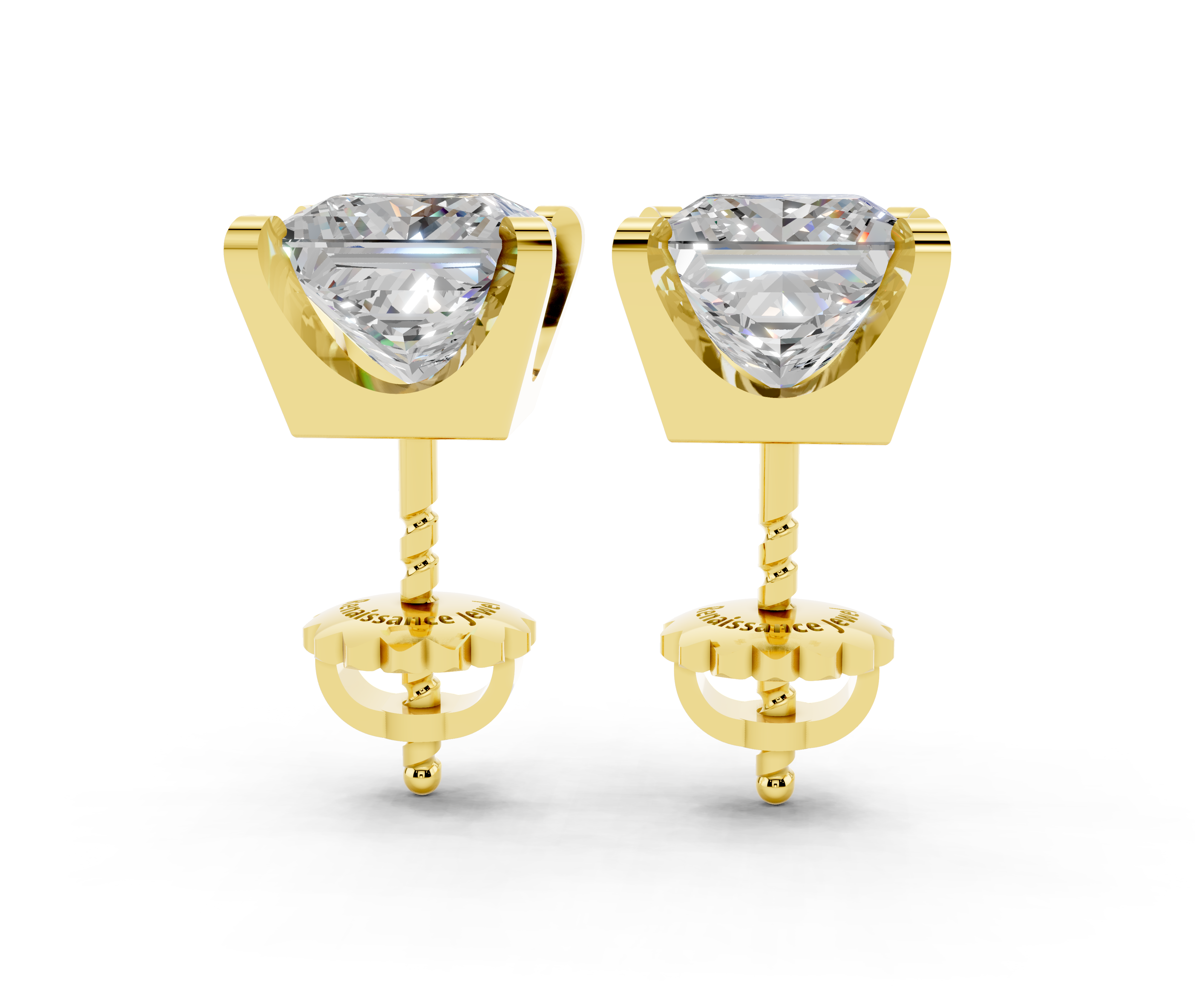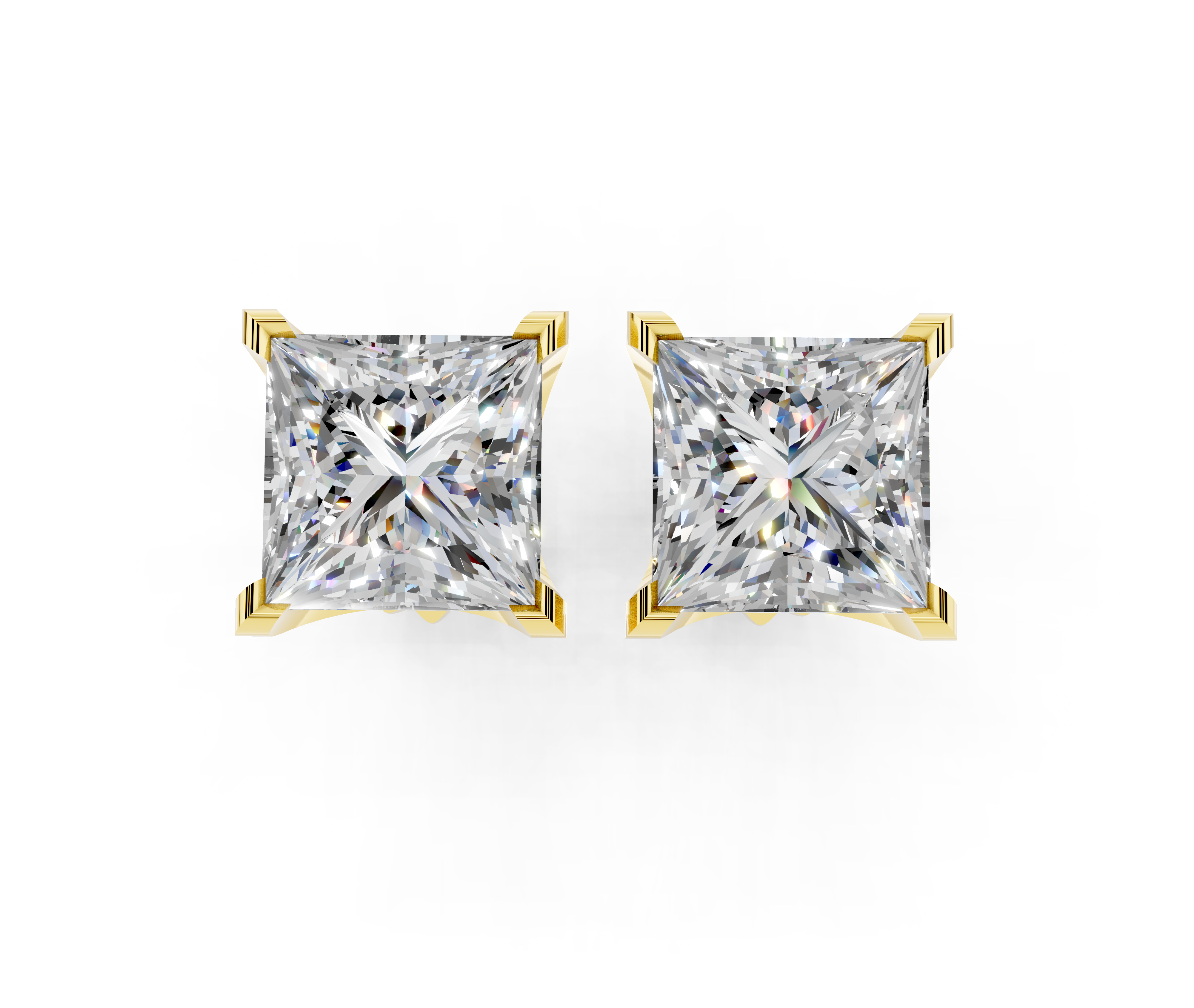 These exquisite earrings feature princess brilliant diamonds, each securely held in a classic four-prong basket setting. The stones are expertly cut to maximize their sparkle and brilliance, making them a timeless addition to any jewelry collection. Set in lustrous yellow gold, these stud earrings offer a perfect blend of elegance and sophistication, ideal for both everyday wear and special occasions. The secure push-back or screw-back closure ensures comfort and ease of wear, making these earrings a must-have for any jewelry enthusiast.