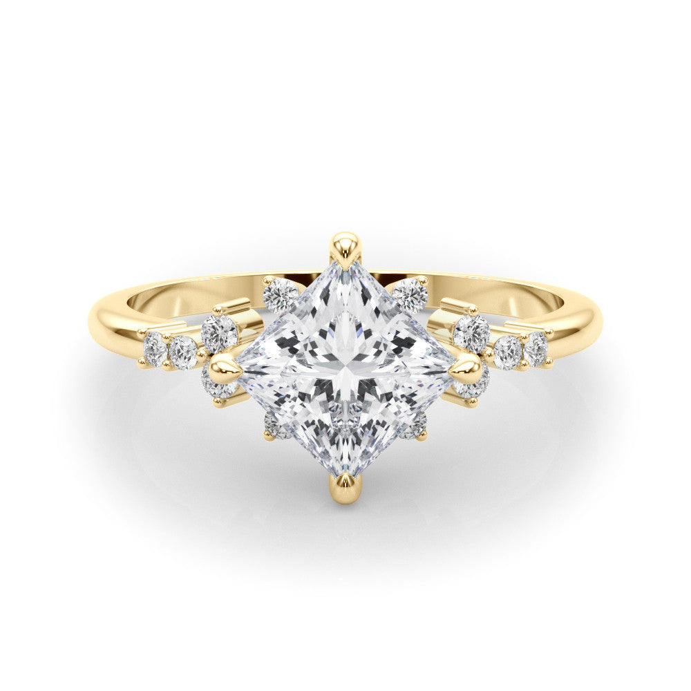 Yellow gold Princess Cut Diamond Ring with Side Stones on a White Gold Band and Four-Prong Setting