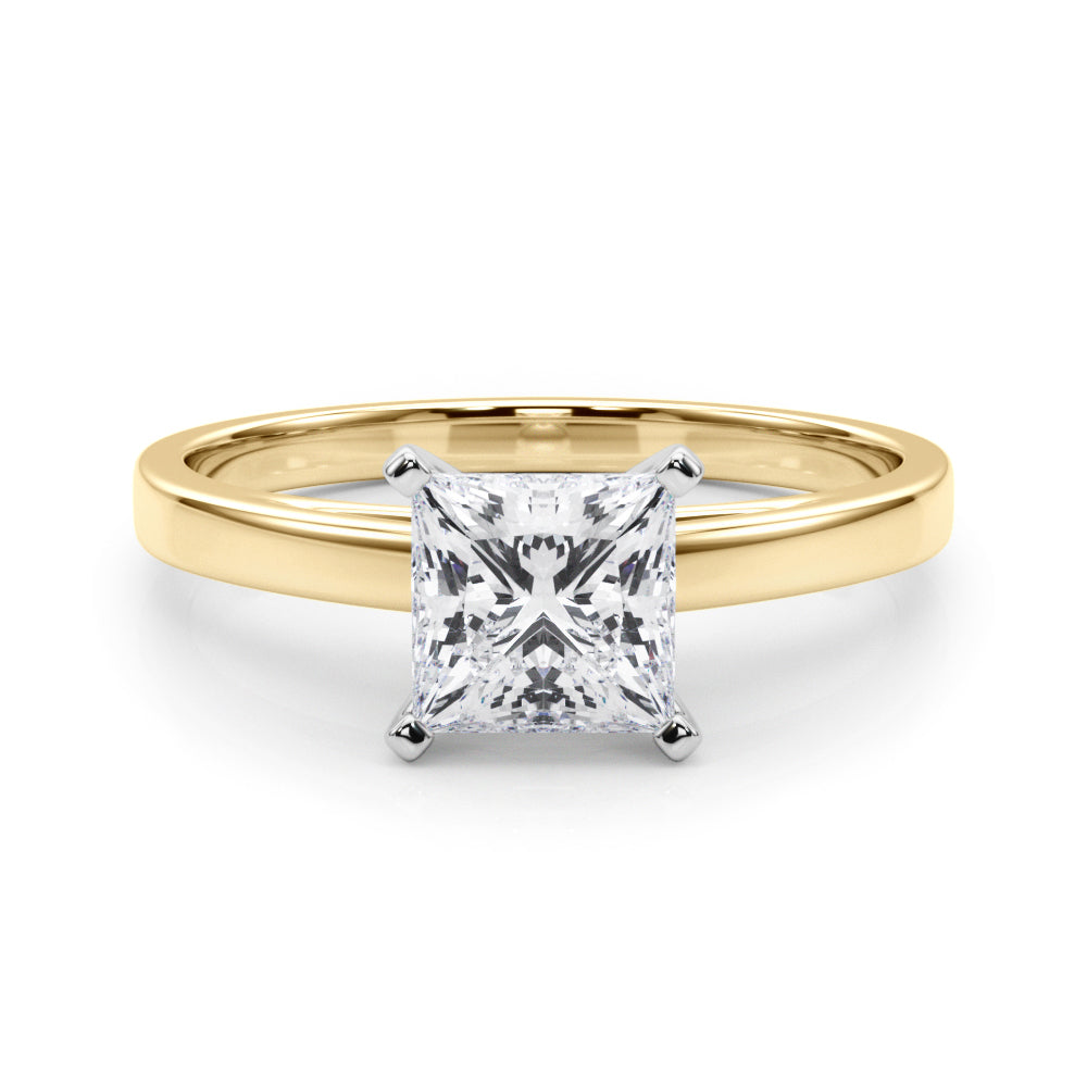 Yellow gold Princess Solitaire Diamond Engagement Ring with Four-Prong Setting on a Classic Band