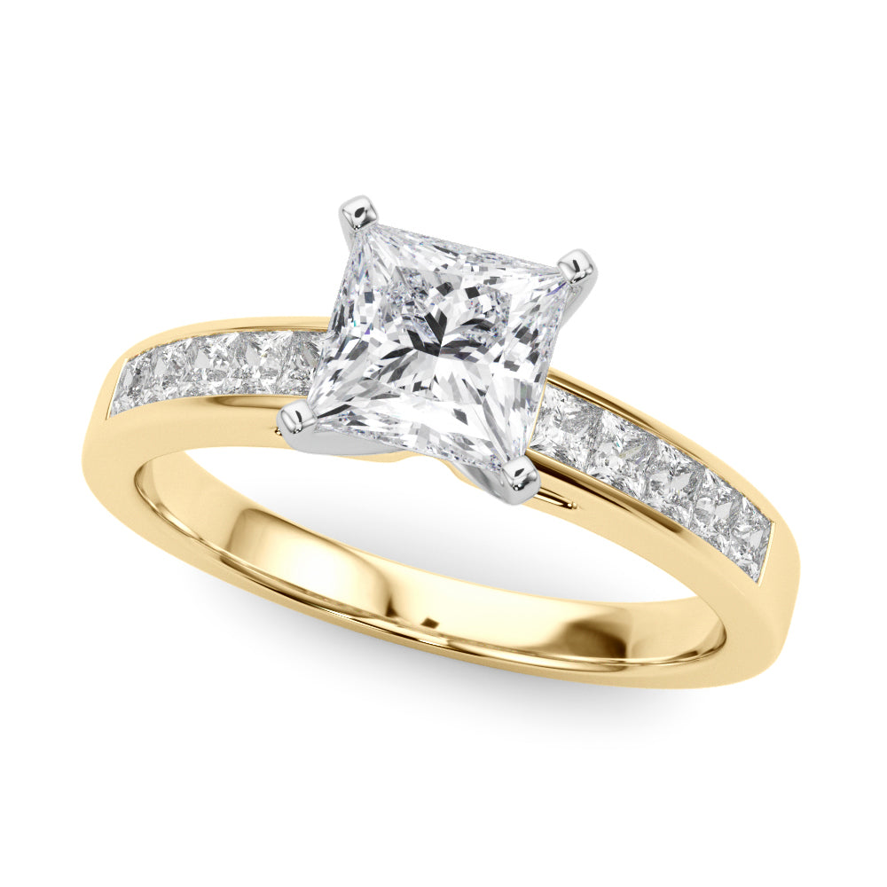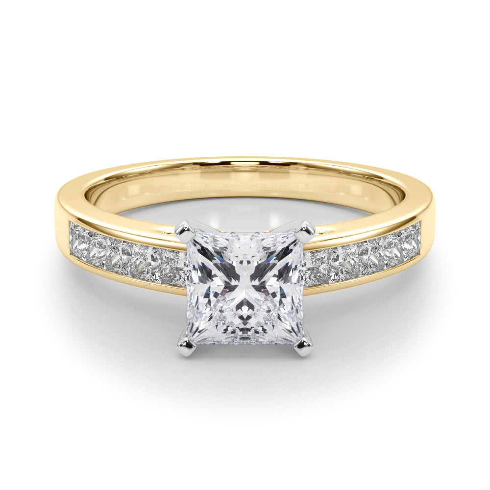 Yellow gold Princess Solitaire Diamond Ring with Channel-Set Band and Four-Prong Setting