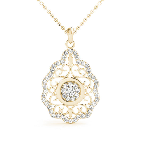 Yellow gold Round Diamond Halo Pendant with Filigree Design