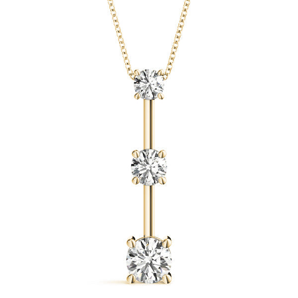 This exquisite pendant features a sleek vertical bar design adorned with three dazzling round diamonds, each securely held in place by a classic four-prong setting. The stones are perfectly aligned, creating a sophisticated and elegant look that captures light beautifully from every angle. Crafted with precision, this pendant is a timeless piece that adds a touch of luxury to any ensemble, making it ideal for both everyday wear and special occasions.