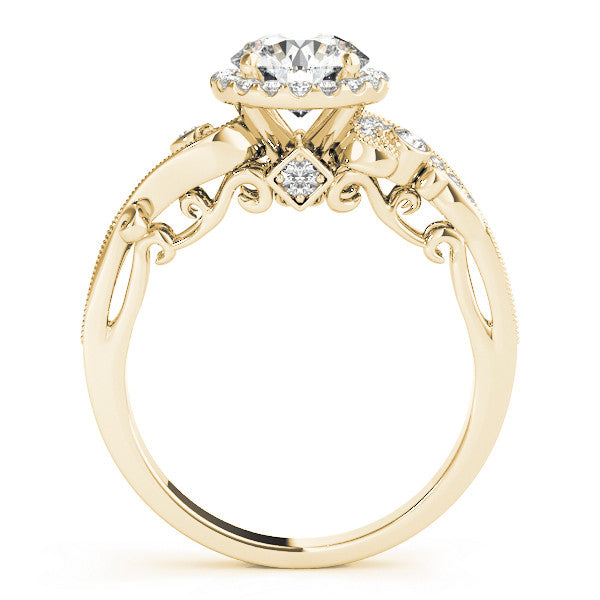 Yellow gold Round Halo Diamond Ring with Milgrain and Bezel Accents on a Split Shank Band