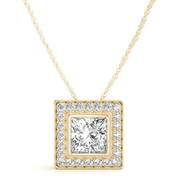 Yellow gold Square Halo Princess Cut Pendant with Bezel Setting