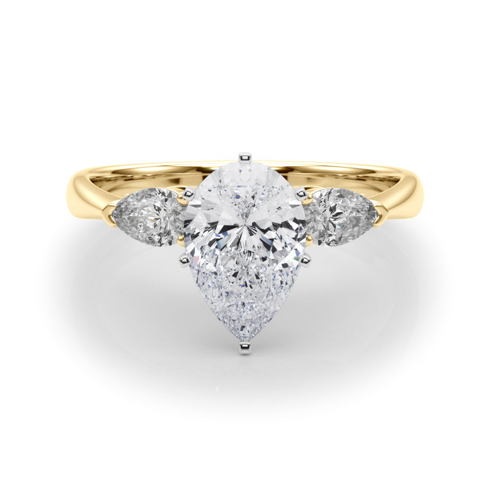 Yellow gold Three-Stone Pear Diamond Ring with Pear Side Stones on a Platinum Band with Four-Prong Setting