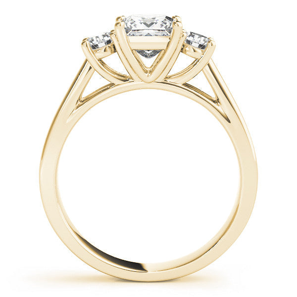 Yellow gold Three-Stone Princess Cut Solitaire Ring with Round Side Stones and Four-Prong Setting